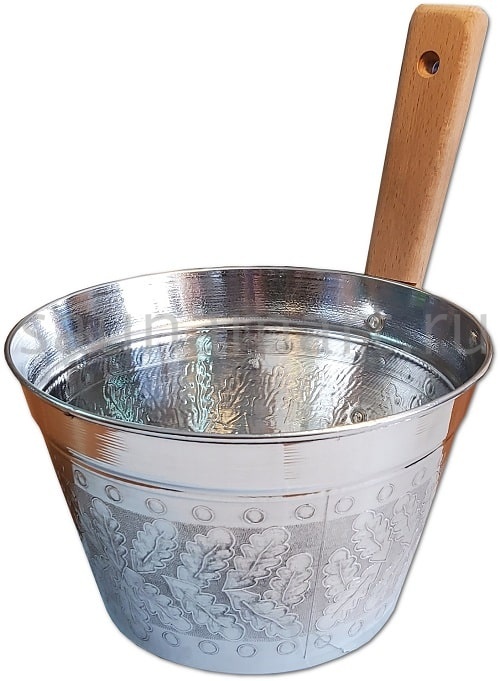 Ушат изготовлен из цветного металла, и потому не подвержен разрушающему воздействию влаги. Удобная для хвата деревянная ручка не нагревается в жарком помещении. А тиснёный узор на корпусе придаёт изделию оригинальный, привлекательный внешний вид.