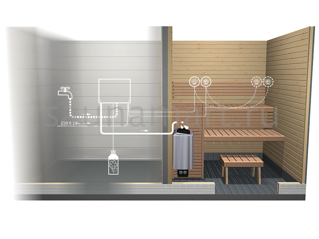 Автодозатор Harvia SASL1 — автоматическая система подачи воды и ароматизированных смесей на камни печи. Обеспечивает удобное управление микроклиматом в сауне.