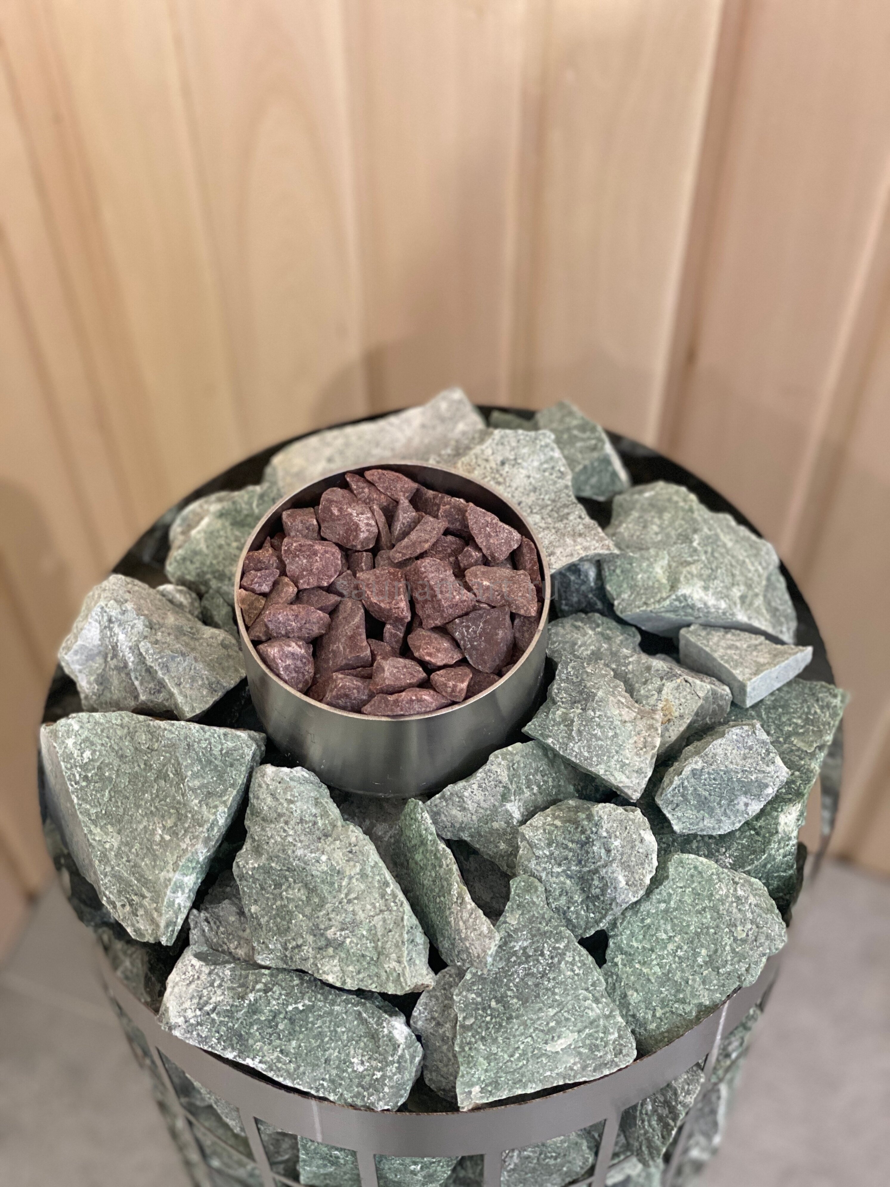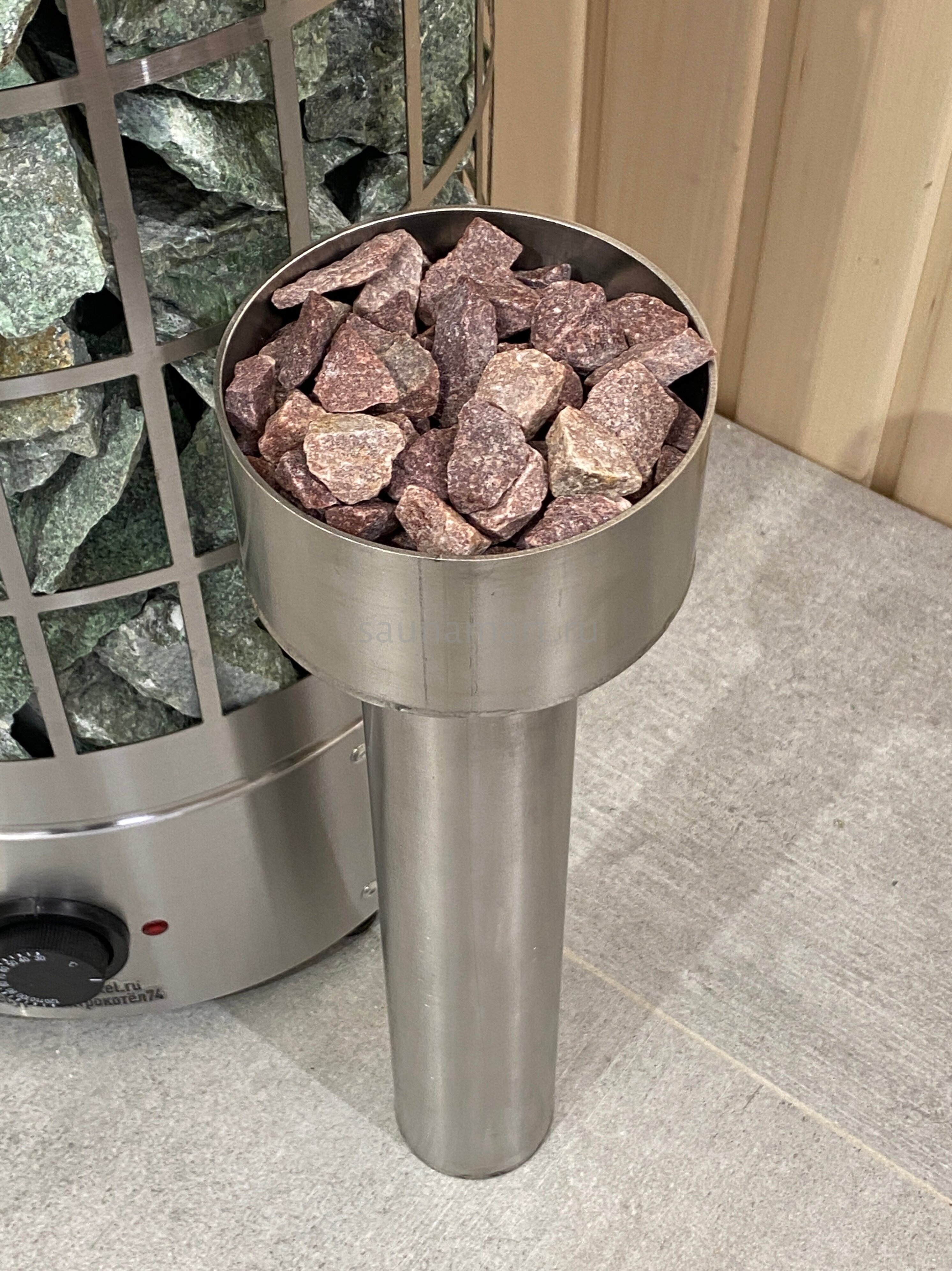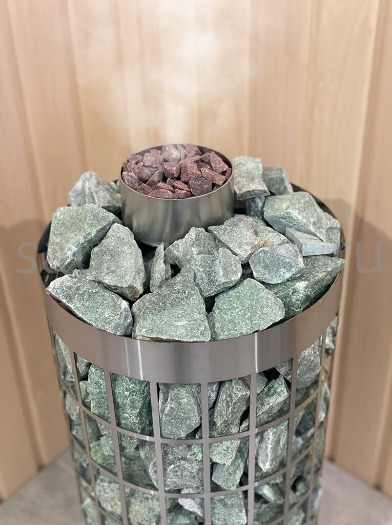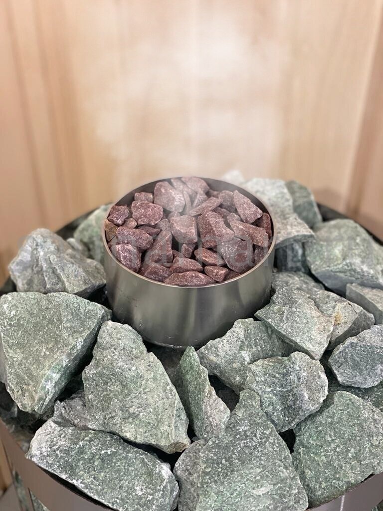 В комплектацию парообразователя входит : сам пароиспаритель (нержавеющая сталь 304 марка, толщитна 2мм), камень в чаше фракция 10-20мм (кварцит малиновый). Данная конструкция легко встраивается между трубчатыми электронагревателями (ТЭН) и камнями. Колба наполняется водой через отверстия в чаше.