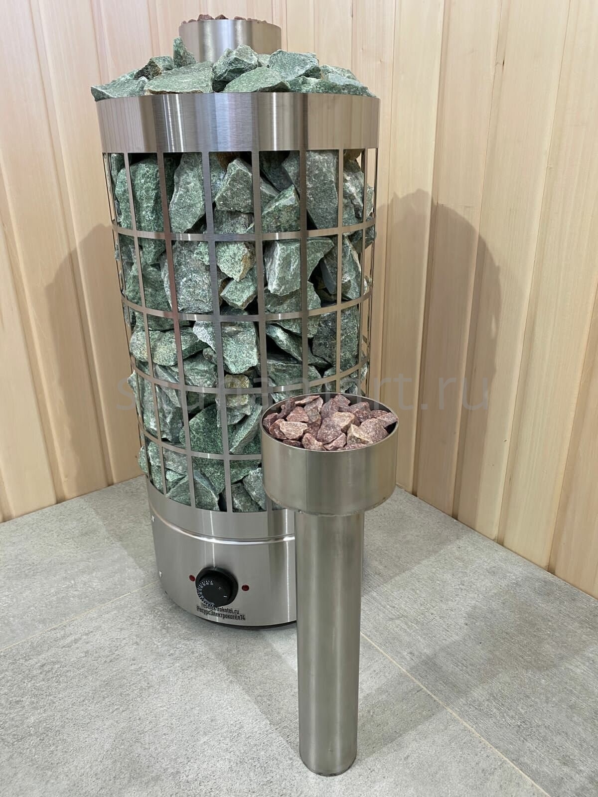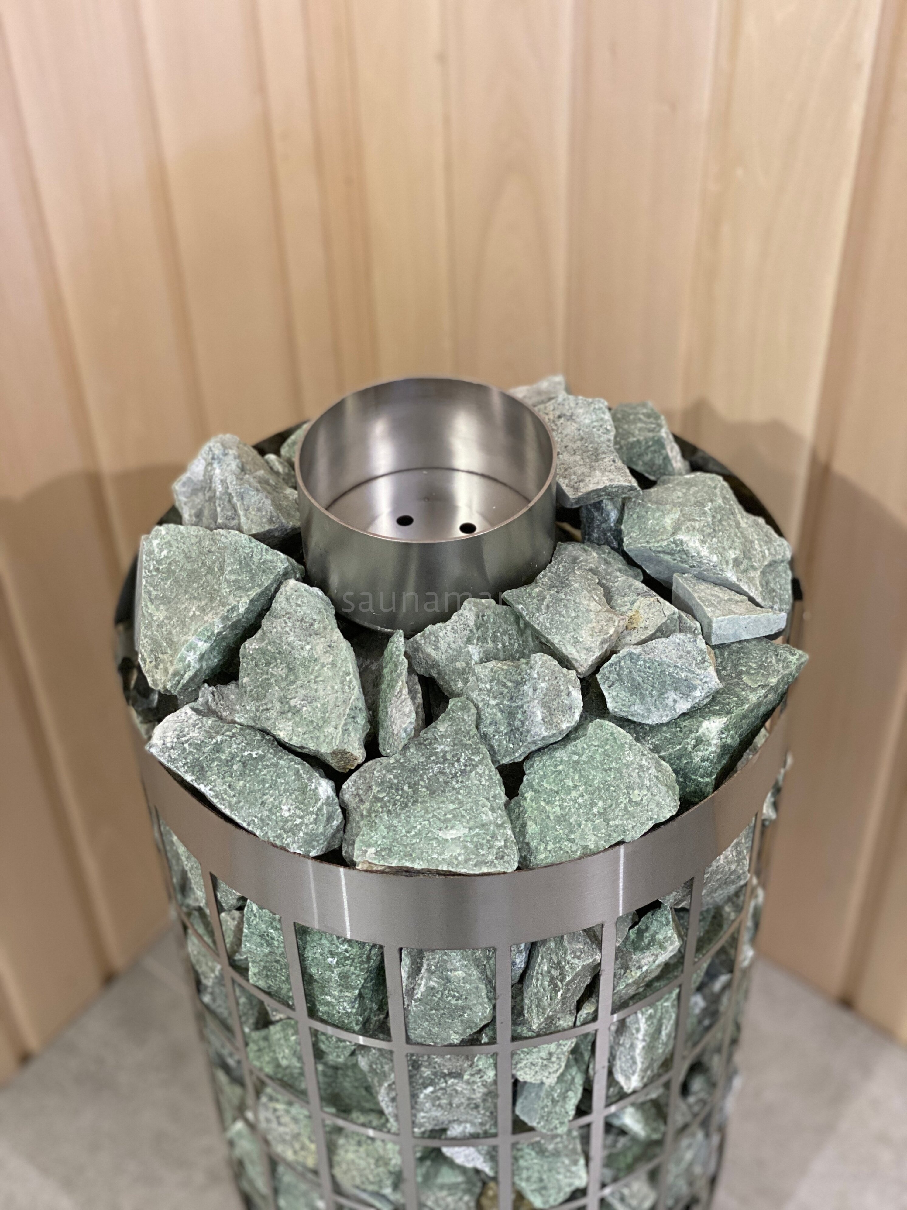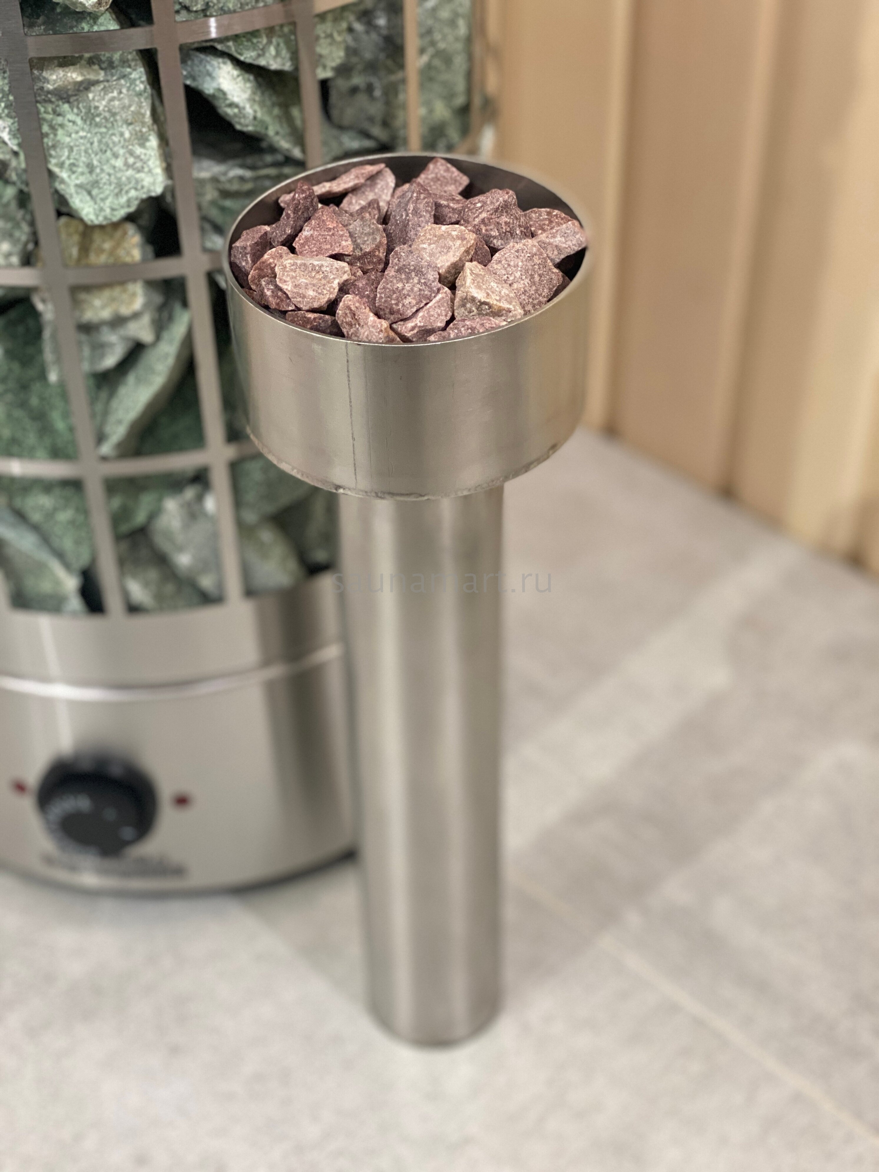 В комплектацию парообразователя входит : сам пароиспаритель (нержавеющая сталь 304 марка, толщитна 2мм), камень в чаше фракция 10-20мм (кварцит малиновый). Данная конструкция легко встраивается между трубчатыми электронагревателями (ТЭН) и камнями. Колба наполняется водой через отверстия в чаше.