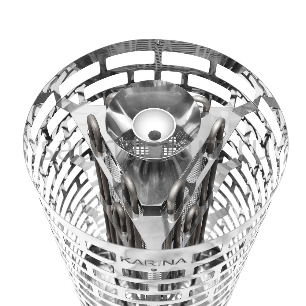 Электрокаменка Karina Nova 10E предназначена для использования в парных объемом до 14м3. Печь выполнена в напольном варианте цилиндрической формы. Напряжение питания– 380В. Данная модель укомплектована 3 ТЭНами, расположенными в виде треугольника. Внизу каменки располагается бак для воды емкостью 3 л, который является парогенератором. Выше парогенератора находится емкость под мелкие камни или нержавеющие шары объемом 2.5 л, вмещающая 5 кг мелкого камня, называемая закрытой каменкой с воронкой для подачи воды и получения мелкодисперсного пара. Электрическая печь Karina Nova 10E многофункциональна, и при правильной эксплуатации она подойдет для любителей как финской сауны, так и русской бани.