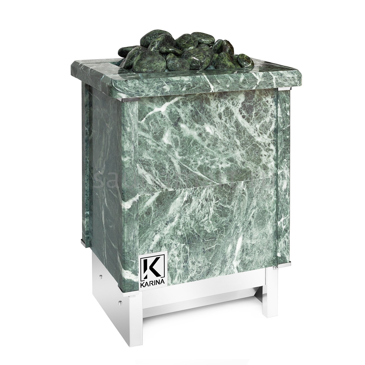 Электрическая каменка со всех сторон облицована натуральным змеевиком. Печь с подобным дизайном стильно смотрится в парильном помещении. Змеевик уже долгие годы используется для внутренней отделки бань. Его называют «аптекарским камнем» за его целебные качества. Минерал оказывает обеззараживающий эффект, положительно влияет на кости, оказывает успокаивающее воздействие и укрепляет иммунитет.