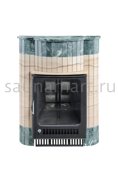 Для печи «Малютка» серии ПФ производитель V?hringer выпускает порталы из натурального мрамора, змеевика и жадеита. Облицовочные материалы поступают на завод в слэбах, заготовки разрезают на пластины, которые затем навешивают на печь.
