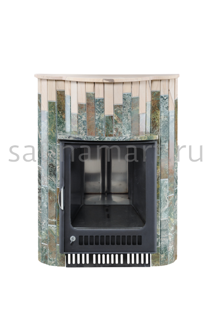 Для печи «Малютка» серии ПФ производитель V?hringer выпускает порталы из натурального мрамора, змеевика и жадеита. Облицовочные материалы поступают на завод в слэбах, заготовки разрезают на пластины, которые затем навешивают на печь.
