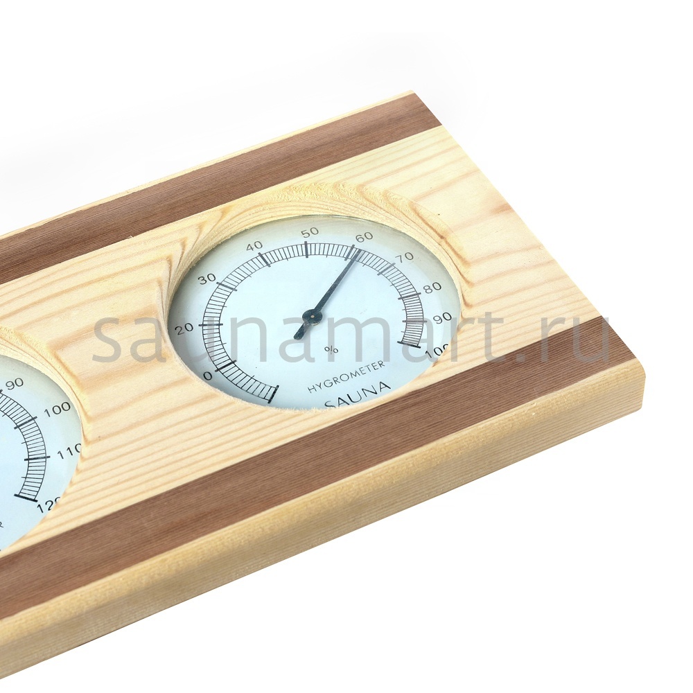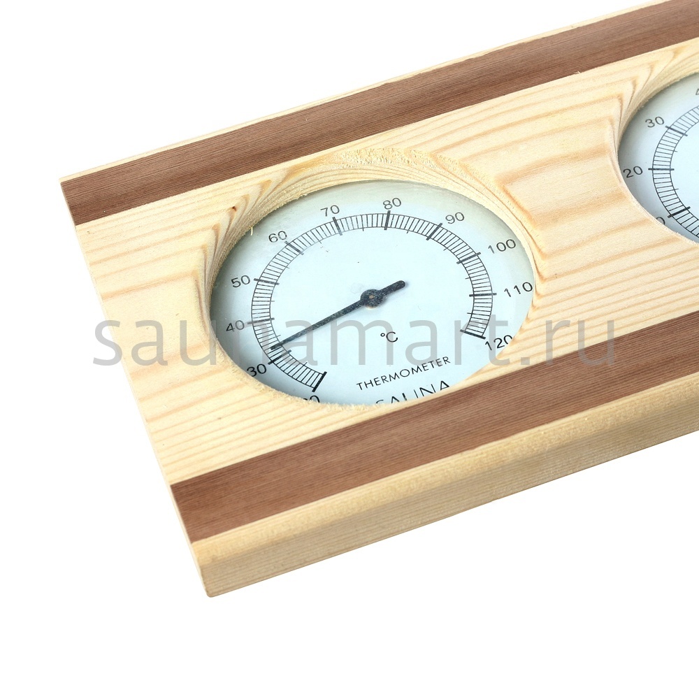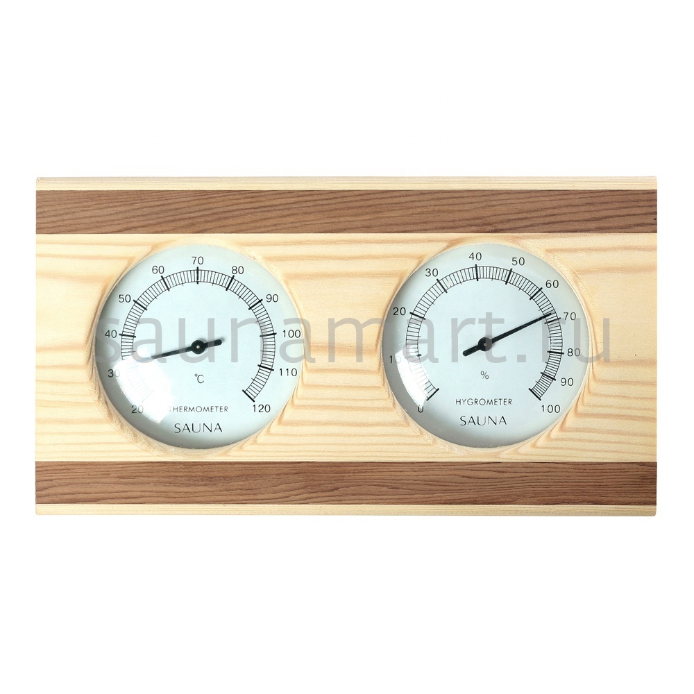 Термогигрометр имеет оригинальную круглую форму. В широкой рамке из древесины кедра  находится циферблат, который сообщит о температуре воздуха. Данный прибор прекрасно подойдёт для использования в парной. Максимально допустимая для измерения температура составляет 120 градусов Цельсия. Этого максимума достаточно для комфортных банных процедур. Нагнетание в парном помещении большей температуры нежелательно, так как может быть опасным для здоровья. Благодаря универсальному дизайну термометр станет прекрасным дополнением любого интерьера.