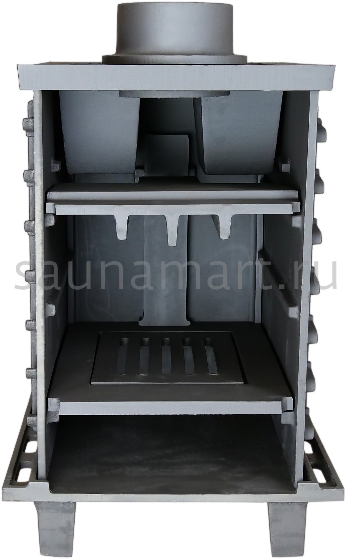 GFS-ЗК 25 (П)2 — это печь с усиленной каменкой большей массы, с единым углублением внутрь топки для дополнительной укладки чугунного заряда. Теплосъемные шипы, со стороны горения пламени, в разы увеличивают площадь соприкосновения огня с каменкой и ускоряют передачу тепла, а также способствуют лучшему дожигу, смешивая потоки пламени и воздуха, поступающего из воздушника. Эти усовершенствования значительно повышают мощность парообразования печи и выдают большее количество пара при непрерывной подаче воды. Каменка печей GFS-ЗК является незаливаемой.